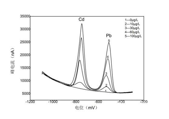 为验证溶出伏安法对于重金属铅、镉离子的测量性能,对0μg/L、10μg/L、30μg/L、60μg/L、100μg/L铅镉标准溶液进行分析测试。由于支持电解液中含有一定浓度的铋离子,在富集过程中,铅离子、镉离子和铋离子可以在玻碳电极表面形成共沉积。在随后的伏安扫描过程中,几种元素又可以被氧化和释放,形成尖锐的溶出峰,如图2所示。铅离子和镉离子的溶出电位分别为-0.5V和-0.8V,峰形尖锐,对称性较好,相互之间不产生干扰,因此铅离子和镉离子可以使用溶出伏安法同时测定。